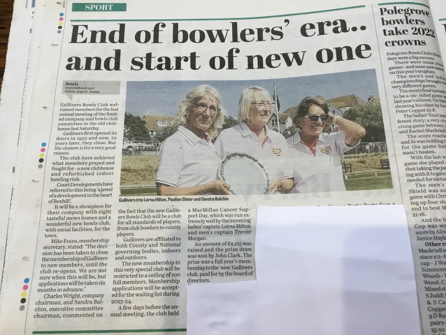 As time progresses, the Gulliver’s site could well command a premium but our objective is not to speculate on future property prices but to retain a bowls facility in the area which, it is hoped, will continue to provide and attract members of our community, who wish to partake in a gentle recreation, whilst making new friends.