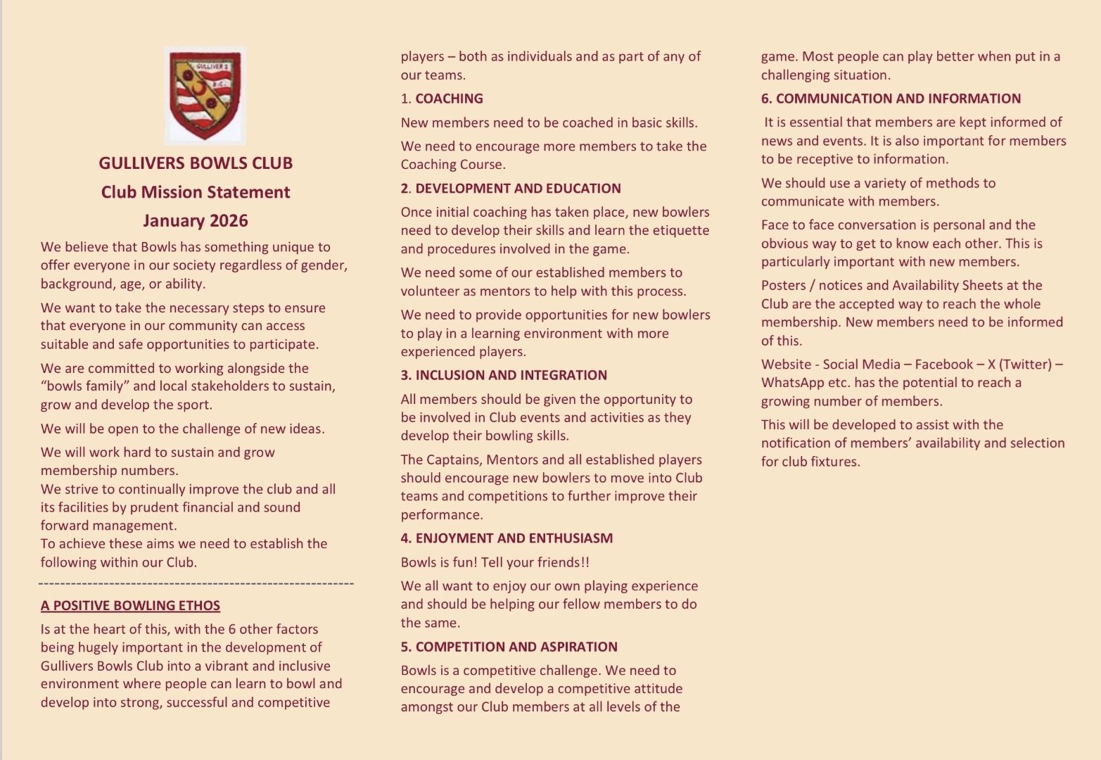 Gullivers Bowls Club - Mission Statement